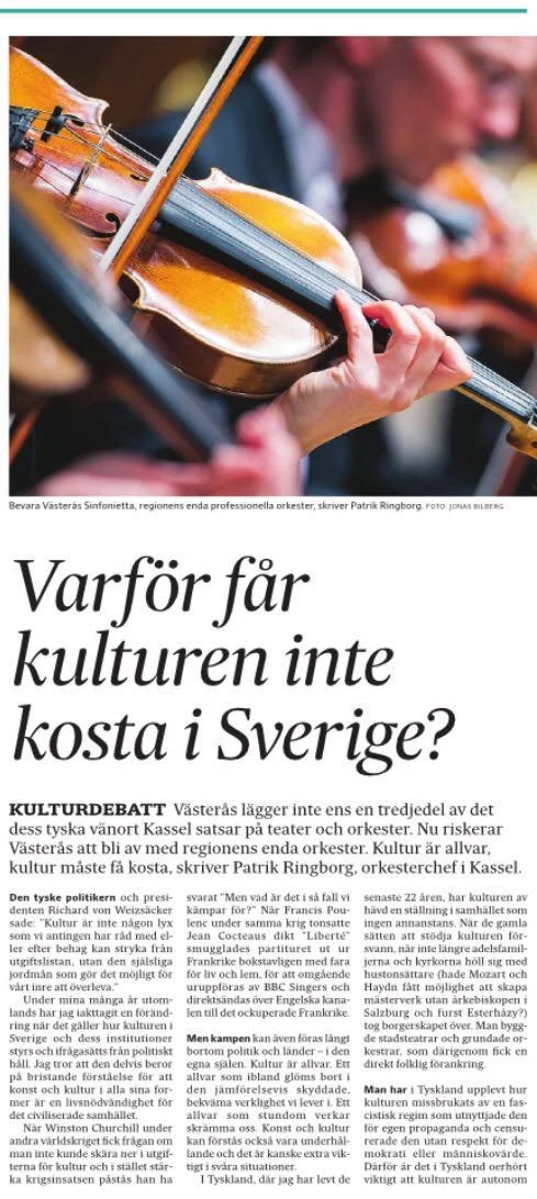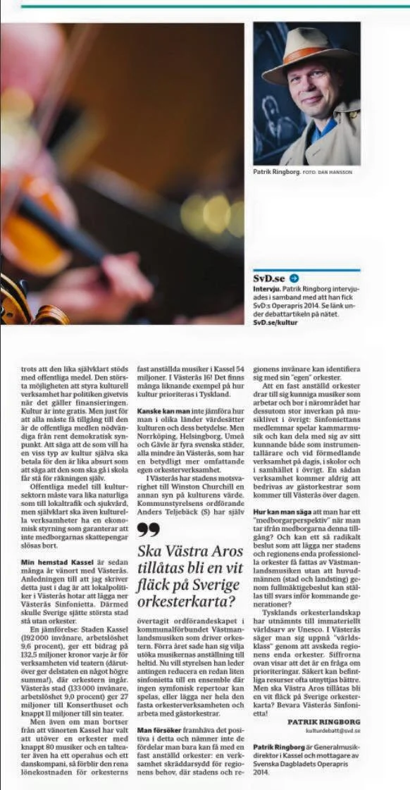 In 2023, Patrik Ringborg wrote an article in the Swedish newspaper Dagens Nyheter about the threat from politicians to diminish or close the orchestra in Norrköping. He also participated in a debate hosted by Swedish National Television on this theme, but also concerning culture and classical music in a wider sense, and about its right to exist.